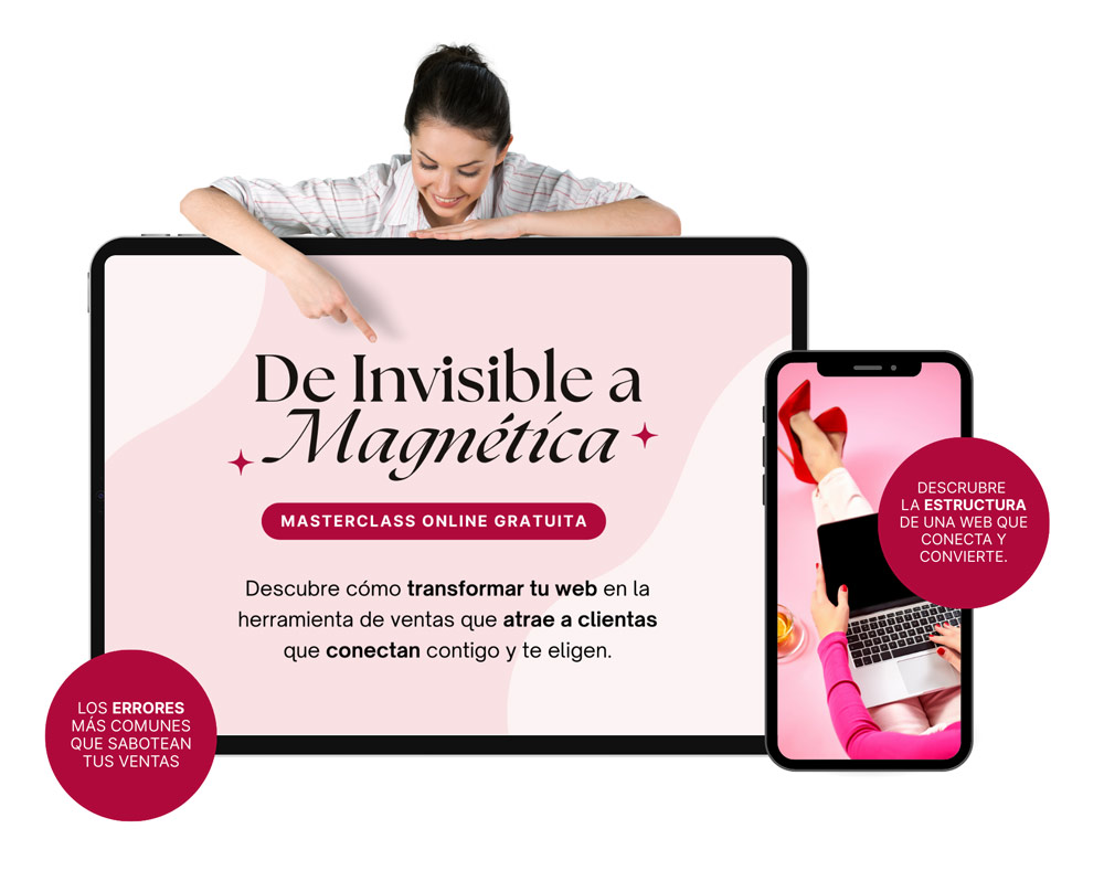 Una masterclass 100% gratuita en la que aprenderás el mapa claro para transformar tu web en tu herramienta de ventas más poderosa, para atraer a clientas que conecten contigo y te elijan en lugar de otra opción más barata.